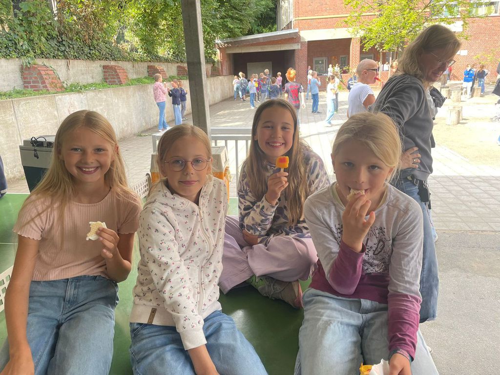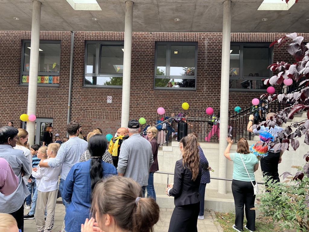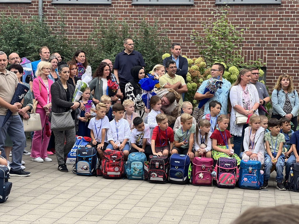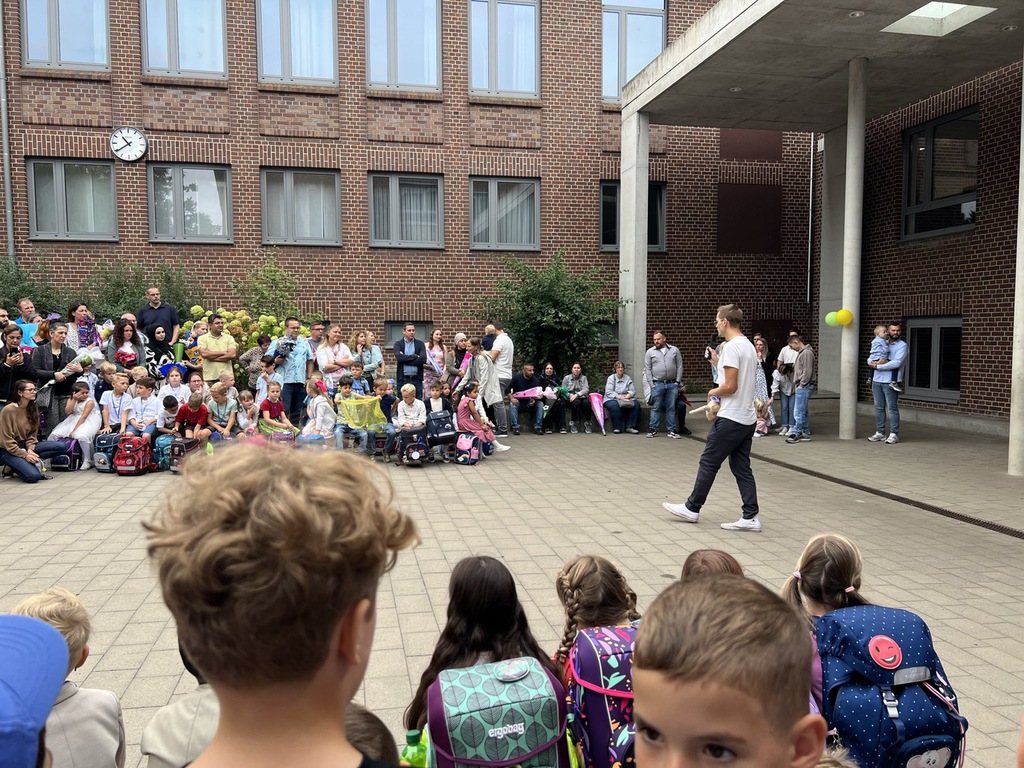Im Anschluss um ca. 10.00 Uhr laden wir alle herzlich ein, auf dem Mensahof das bunte Programm unserer Einschulungsfeier zu genießen. Mit Musik, kleinen Aufführungen und der Vorstellung der neuen Klassenlehrerinnen und Klassenlehrer möchten wir den Kindern und ihren Familien einen unvergesslichen Tag bereiten. Die Kinder der Klassen 1b, 1c, und 1d dürfen an diesem ersten Tag selbstverständlich ihre neuen Klassenräume, die Lehrkräfte kennenlernen und die erste Schulstunde erleben. Währenddessen haben die Eltern die Möglichkeit, die vom Förderverein angebotenen Getränke zu genießen.