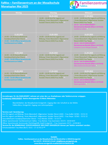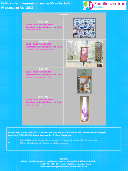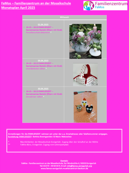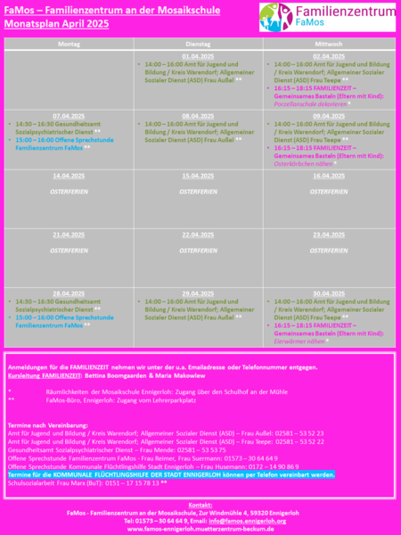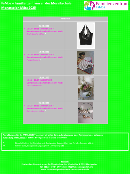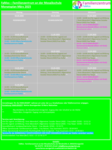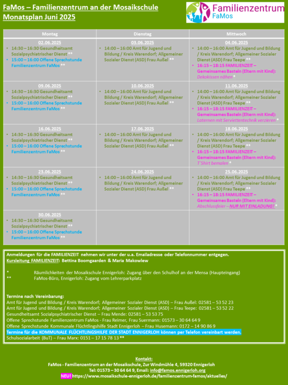 Anmeldungen nehmen wir telefonisch unter der Handynummer 01573 – 30 64 64 9 oder per Email unter info@famos.ennigerloh.org entgegen.